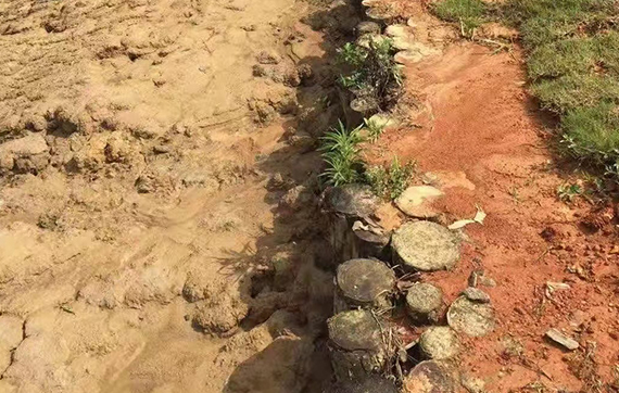 改造魚塘,堤壩用木樁加固為了穩定壩的基礎,兩邊用松木樁固定;相對來說木樁成本較低。